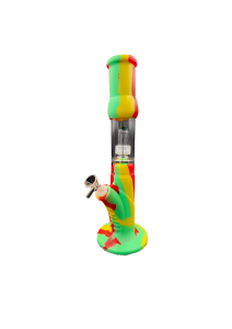 A colorful silicone and glass water pipe with vibrant red, yellow, and green accents. It features a sturdy grip, a percolator for smooth filtration, and a detachable bowl for easy cleaning. Ideal for both style and functionality.