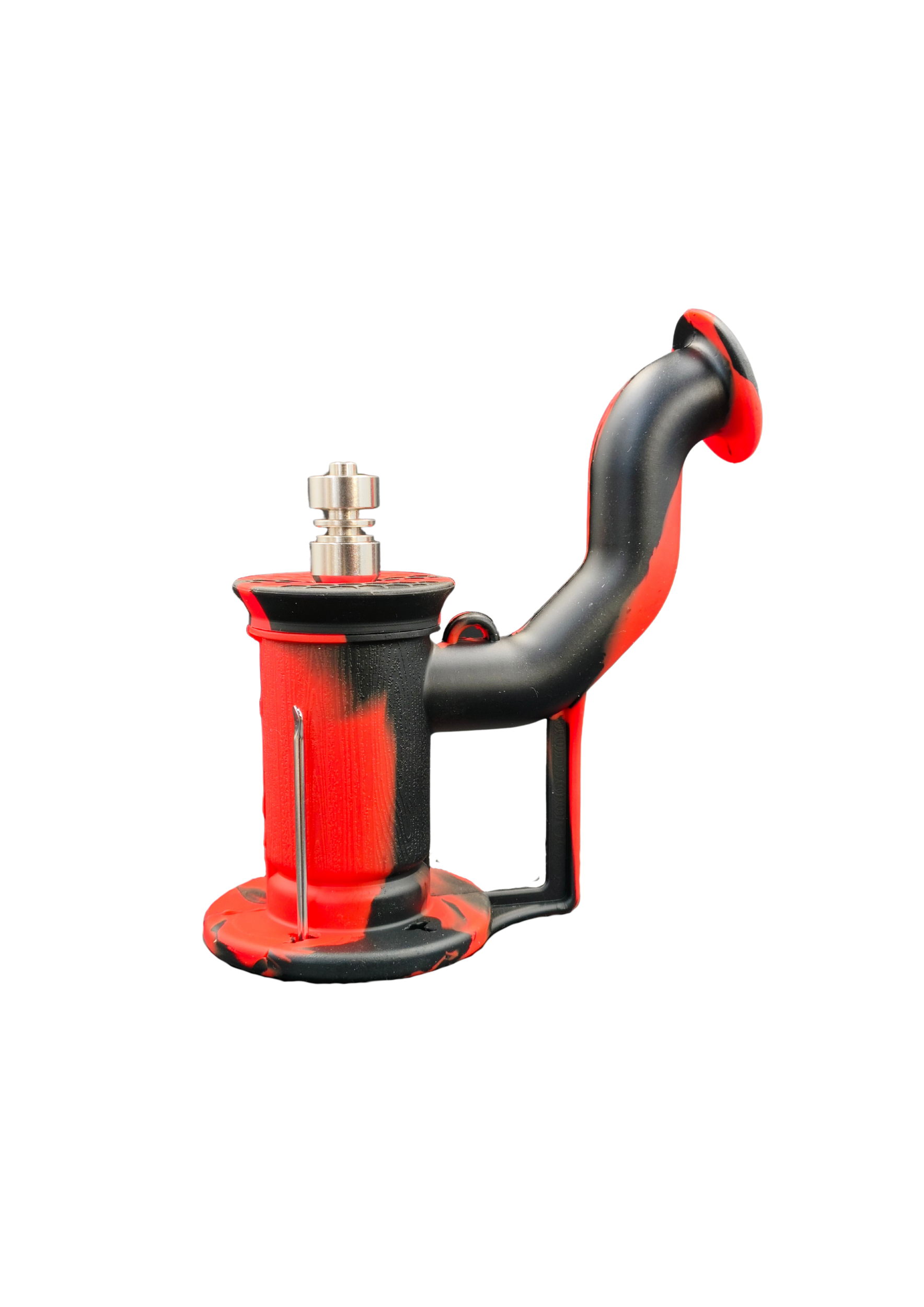 A rugged black and red silicone dab rig with a sturdy, curved design and a metal nail attachment. Durable and heat-resistant, perfect for easy and portable dabbing sessions.