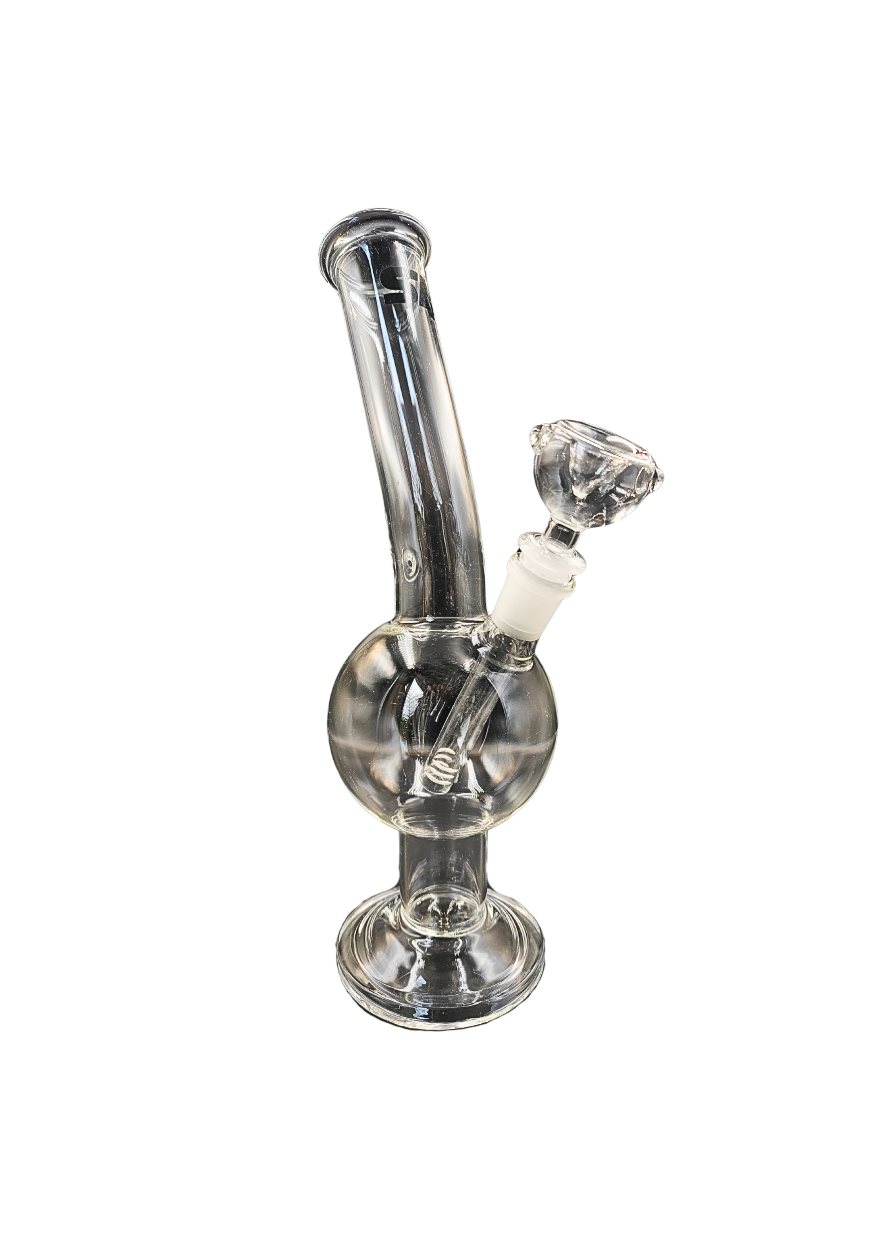 A clear glass water pipe with a round chamber design and an angled neck. Features a sturdy base and a detachable bowl for easy use. Elegant and functional, ideal for smooth sessions.
