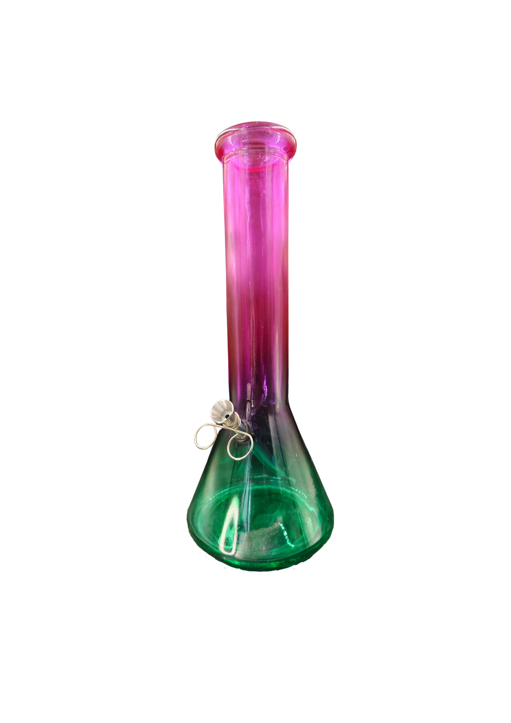 This vibrant, dual-toned glass water pipe features a unique design with a pink neck and a green base, creating an eye-catching aesthetic. The bong is equipped with a metal bowl and a secure clamp, ensuring stability during use. Ideal for both novice and experienced users.
