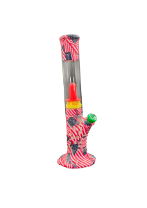 A vibrant glass water pipe wrapped in an American flag design, featuring a unique red percolator and a green detachable bowl. Eye-catching and patriotic, this piece offers smooth filtration and easy handling.