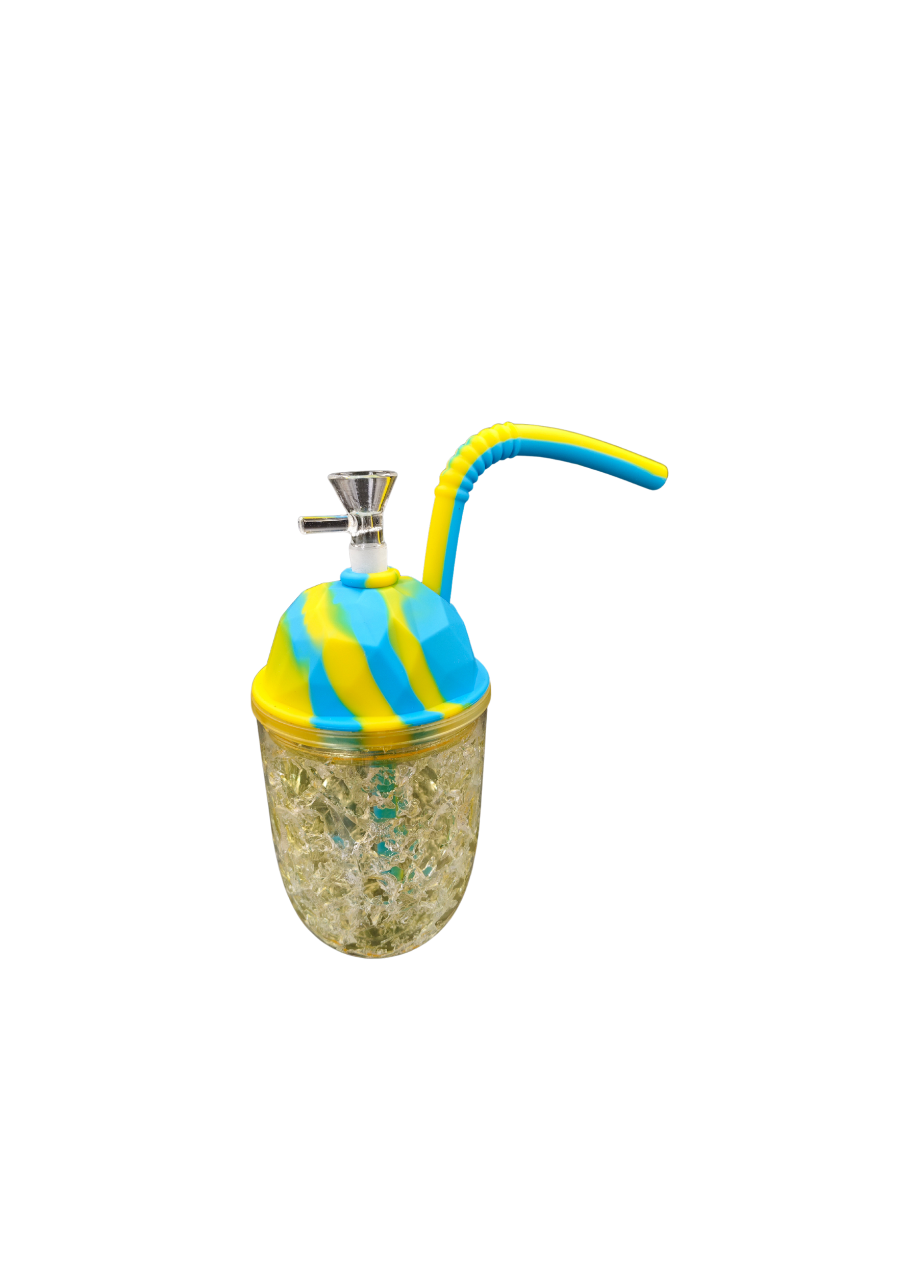A vibrant water pipe with a blue and yellow silicone lid, flexible straw-like mouthpiece, and an acrylic bottom designed to resemble crushed ice. Includes a detachable bowl for easy use and cleaning.