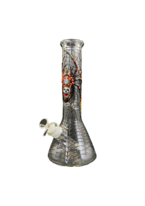 This Halloween-themed glass bong features a beaker design with intricate spider web patterns, a vibrant red spider, and a playful skull. Made from high-quality glass, it combines art and functionality, with a removable bowl for easy cleaning. A unique addition to any collection!