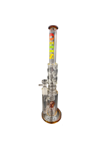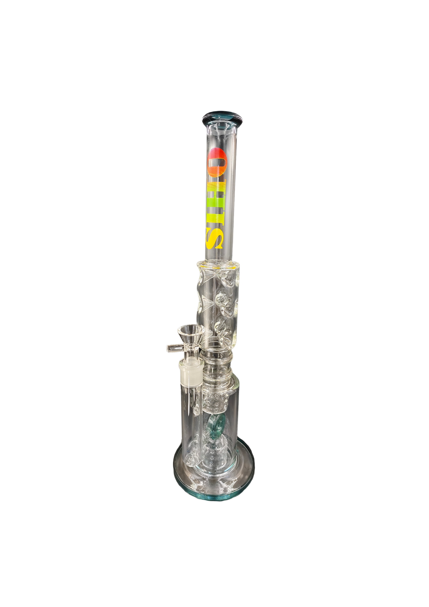 This is a stylish glass water pipe, designed for smooth and enjoyable sessions. It features a clear body with colorful lettering, showcasing a modern aesthetic. The intricate details on the midsection add visual appeal, while the water chamber provides effective filtration for enhanced flavor and reduced harshness. The sturdy base ensures stability during use, making it a practical choice for both beginners and experienced users. Perfect for those seeking a reliable, eye-catching piece for their collection.