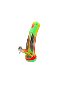 A colorful silicone and glass water pipe with a tilted design, featuring red, yellow, and green accents. It comes with a detachable bowl for convenience and a unique angled shape for easy handling.